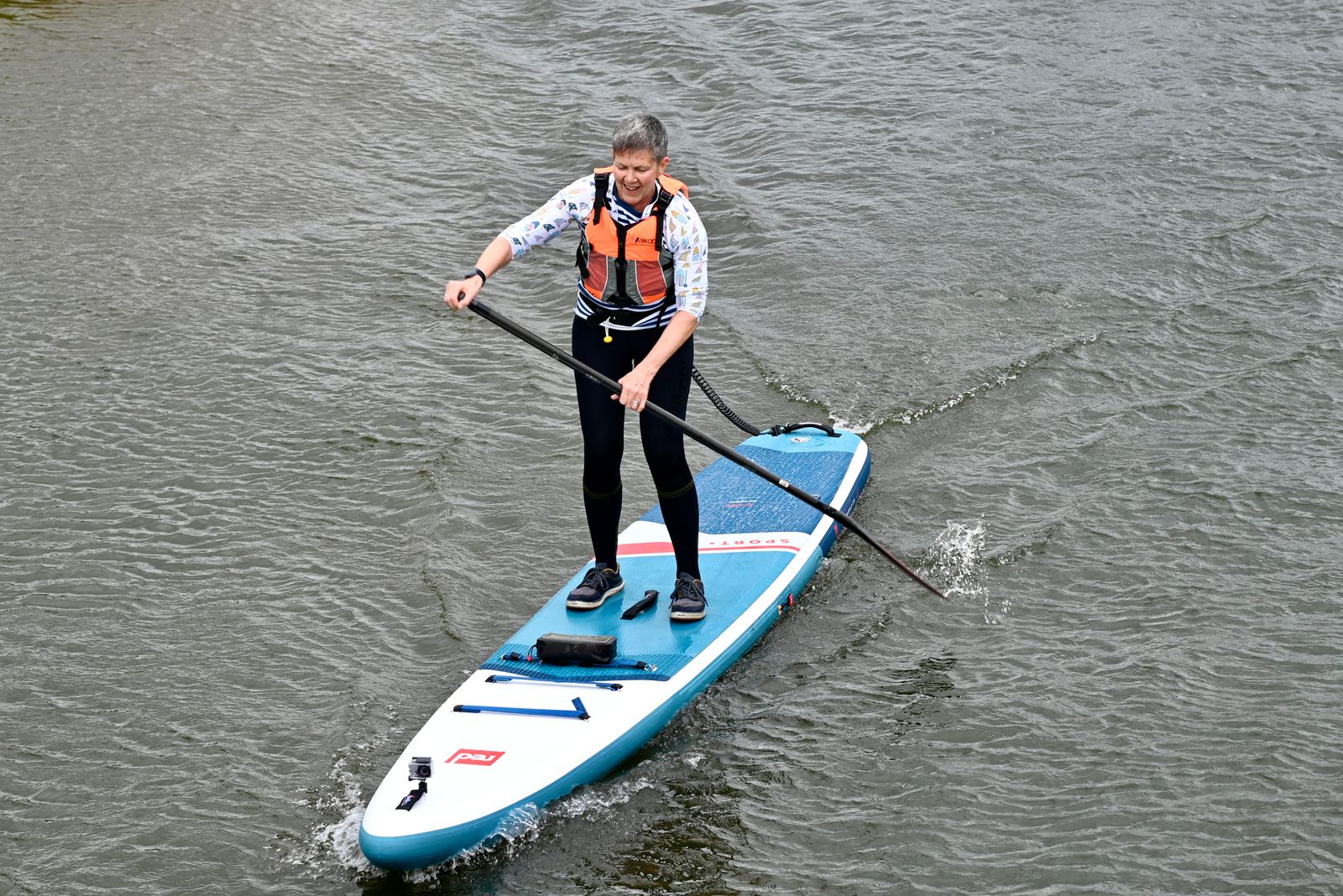 I finally got my new Sport + on the water last week. Anticipating a calm day, I was alarmed to find that by the time I was inflated and ready to go out, the wind had picked up considerably, and the chop had gotten real. Realizing how much lighter the Sport + is vs my Voyager, I feared I was about to get tossed around and braced myself for a possible cold plunge. My fears were alleviated when I stood up and felt instantly at home. Within minutes, I was cruising as though I'd been paddling the Sport + for years. Though lighter and more narrow than the Voyager, this board is no less stable, while being quicker and much more nimble. I can change direction much more easily, and I don't find myself locked into paddling on one side or the other for long stretches.